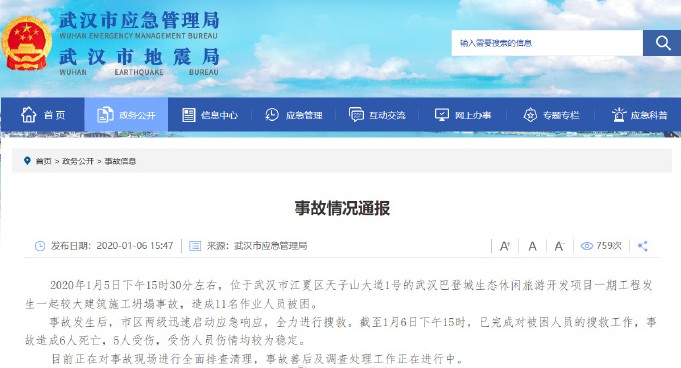 【中网资讯财经消息】昨日(1月6日),武汉市应急管理局发布消息,1月5日下午,位于武汉市江夏区的武汉巴登城生态休闲旅游开发项目一期工程发生一起较大建筑施工坍塌事故,造成6人死亡,5人受伤。