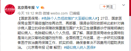 27日,国家医保局全面开展疫情防控再动员、再部署,强调会同财政部将此前针对确诊病人建立的综合保障政策覆盖范围扩大到卫生健康委诊疗指南明确的疑似病人,免除疑似病人个人负担。据了解,国家医保局结合全国特别是湖北武汉等地疫情防控形势,全面梳理工作进展,进一步研究加强患者医疗救治费用保障工作,抓实抓细,确保患者决不因费用问题耽误救治。(北青 记者 解丽)