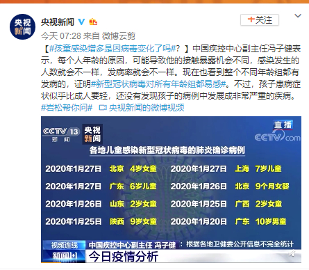 中国疾控中心副主任冯子健表示,每个人年龄的原因,可能导致他的接触暴露机会不同,感染发生的人数就会不一样,发病率就会不一样。现在也看到整个不同年龄组都有发病的,证明#新型冠状病毒对所有年龄组都易感#。不过,孩子患病症状似乎比成人要轻,还没有发现孩子的病例中发展成非常严重的疾病。