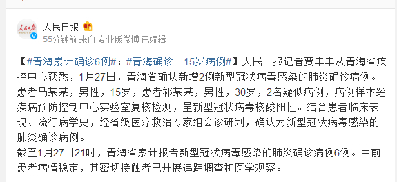 人民日报记者贾丰丰从青海省疾控中心获悉,1月27日,青海省确认新增2例新型冠状病毒感染的肺炎确诊病例。患者马某某,男性,15岁,患者祁某某,男性,30岁,2名疑似病例,病例样本经疾病预防控制中心实验室复核检测,呈新型冠状病毒核酸阳性。结合患者临床表现、流行病学史,经省级医疗救治专家组会诊研判,确认为新型冠状病毒感染的肺炎确诊病例。