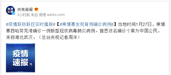 当地时间1月27日,柬埔寨西哈努克港确诊一例新型冠状病毒肺炎病例。据悉该名确诊个案为中国公民,来自湖北武汉。(总台央视记者周洋)
