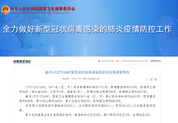 1月27日0-24时,30个省(区、市)报告新增确诊病例1771例,新增重症病例515例,新增死亡病例26例(湖北省24例、北京市1例、海南省1例),新增治愈出院病例9例,新增疑似病例2077例。