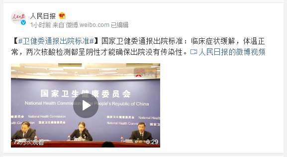 国家卫健委通报出院标准:临床症状缓解,体温正常,两次核酸检测都呈阴性才能确保出院没有传染性。