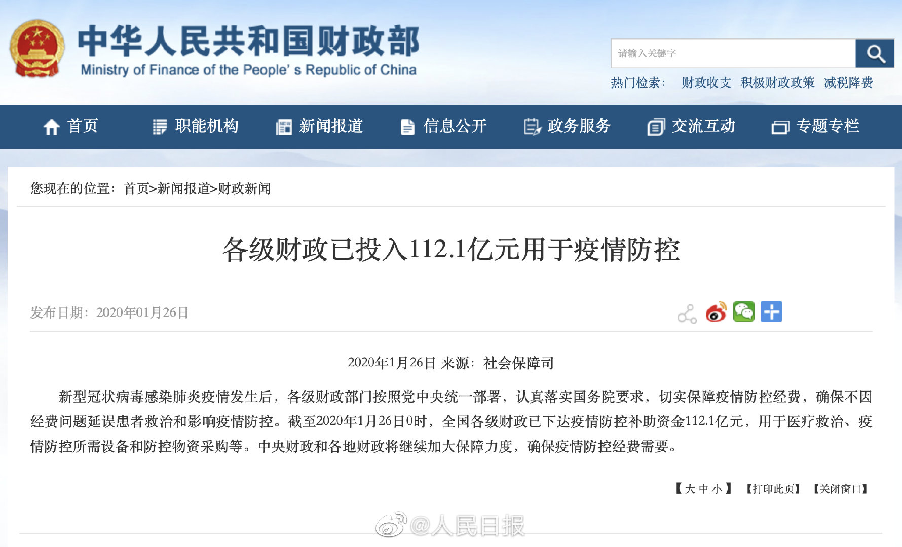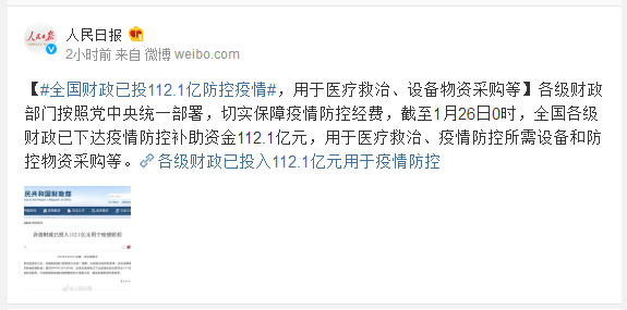 【#全国财政已投112.1亿防控疫情#,用于医疗救治、设备物资采购等】各级财政部门按照党中央统一部署,切实保障疫情防控经费,截至1月26日0时,全国各级财政已下达疫情防控补助资金112.1亿元,用于医疗救治、疫情防控所需设备和防控物资采购等。