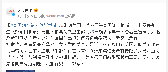 据美国广播公司等美国媒体报道,亚利桑那州卫生服务部门和该州马里科帕县公共卫生部门26日确认该县一名患者已被确诊为感染新型冠状病毒。这是美国目前出现的第五例新型冠状病毒感染患者。