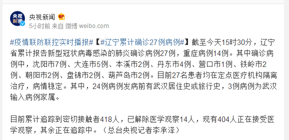 截至今天15时30分,辽宁省累计报告新型冠状病毒感染的肺炎确诊病例27例,重症病例14例。其中确诊病例中,沈阳市7例、大连市5例、本溪市2例、丹东市4例、营口市1例、铁岭市2例、朝阳市2例、盘锦市2例、葫芦岛市2例。目前27名患者均在定点医疗机构隔离治疗,病情稳定。其中,24例病例发病前有武汉居住史或旅行史,3例病例为武汉输入病例家属。