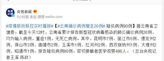 据云南省卫健委:截至今天12时,云南省累计报告新型冠状病毒感染的肺炎确诊病例26例,均为输入病例,重症1例,无死亡病例。其中,昆明市7例、丽江市5例、德宏州2例、保山市3例、曲靖市2例、玉溪市1例、红河州2例、西双版纳州1例、大理州2例、昭通市1例。报告疑似病例90例。密切接触者医学观察496人。(总台央视记者王溪 陈政)