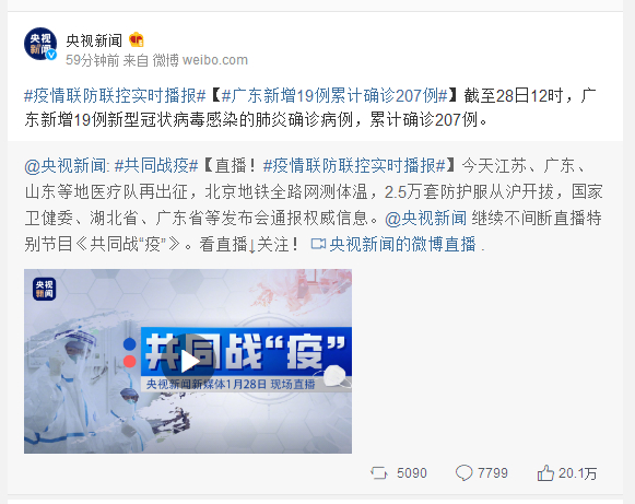 截至28日12时,广东新增19例新型冠状病毒感染的肺炎确诊病例,累计确诊207例。