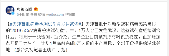 天津首批针对新型冠状病毒感染肺炎的“2019-nCoV病毒检测试剂盒”,共计1万人份已发往武汉。这些试剂盒经检测合格后,将用于一线检测。据介绍,生产企业目前试剂原材料供货稳定,正加班加点开足马力生产,计划1月底前完成5万人份的生产目标,全部无偿提供给湖北等地。(总台央视记者王晓沛 丁旭)