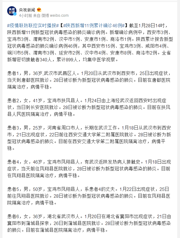 患者4,女,46岁,宝鸡市凤翔县人,有武汉返陕发热病人接触史。1月18日出现症状,当天前往凤翔县医院就诊,28日被诊断为新型冠状病毒感染的肺炎。目前在凤翔县医院隔离治疗,病情平稳。