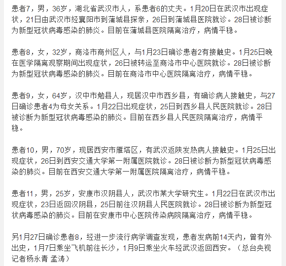 患者11,男,25岁,安康市汉阴县人,武汉市某大学研究生。1月22日在武汉市出现症状,23日返回汉阴县,25日前往汉阴县人民医院就诊。28日被诊断为新型冠状病毒感染的肺炎。目前在安康市中心医院传染病院隔离治疗,病情平稳。