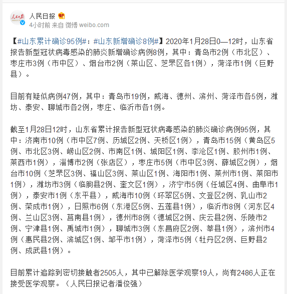 截至1月28日12时,山东省累计报告新型冠状病毒感染的肺炎确诊病例95例,其中:济南市10例(市中区7例、历城区2例、天桥区1例),青岛市15例(黄岛区5例、市北区3例、崂山区2例、市南区1例、城阳区1例、李沧区1例、胶州市1例、莱西市1例),淄博市2例(张店区),枣庄市5例(市中区3例、薛城区2例),烟台市10例(芝罘区3例、福山区3例、莱山区1例、海阳市1例、莱州市1例、莱阳市1例),潍坊市3例(临朐县2例、奎文区1例),济宁市5例(任城区4例、曲阜市1例),泰安市1例(东平县),威海市10例(环翠区5例、文登区2例、乳山市2例、荣成市1例),日照市6例(东港区5例、五莲县1例),临沂市8例(河东区4例、兰山区3例、莒南县1例),德州市8例(德城区2例、庆云县2例、乐陵市2例、宁津县1例、禹城市1例),聊城市3例(东昌府区2例、莘县1例),滨州市4例(惠民县2例、滨城区1例、邹平市1例),菏泽市5例(牡丹区2例、巨野县2例、成武县1例)。