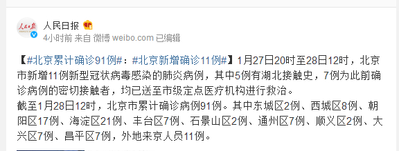 截至1月28日12时,北京市累计确诊病例91例。其中东城区2例、西城区8例、朝阳区17例、海淀区21例、丰台区7例、石景山区2例、通州区7例、顺义区2例、大兴区7例、昌平区7例,外地来京人员11例。