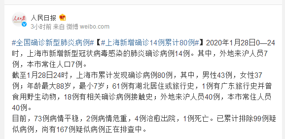 截至1月28日24时,上海市累计发现确诊病例80例,其中,男性43例,女性37例;年龄最大88岁,最小7岁;61例有湖北居住或旅行史,1例有广东旅行史并曾食用野生动物,18例有相关确诊病例接触史;外地来沪人员40例,本市常住人员40例。