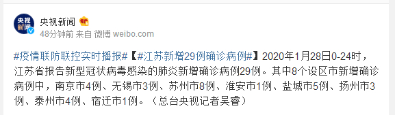 2020年1月28日0-24时,江苏省报告新型冠状病毒感染的肺炎新增确诊病例29例。其中8个设区市新增确诊病例中,南京市4例、无锡市3例、苏州市8例、淮安市1例、盐城市5例、扬州市3例、泰州市4例、宿迁市1例。(总台央视记者吴睿)