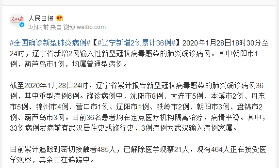 截至2020年1月28日24时,辽宁省累计报告新型冠状病毒感染的肺炎确诊病例36例,其中重型病例6例。确诊病例中,沈阳市8例、大连市5例、本溪市2例、丹东市5例、锦州市4例、营口市1例、辽阳市1例、铁岭市2例、朝阳市3例、盘锦市2例、葫芦岛市3例。目前36名患者均在定点医疗机构隔离治疗,病情平稳。其中,33例病例发病前有武汉居住史或旅行史,3例病例为武汉输入病例家属。