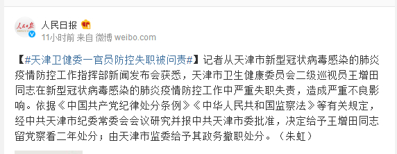 记者从天津市新型冠状病毒感染的肺炎疫情防控工作指挥部新闻发布会获悉,天津市卫生健康委员会二级巡视员王增田同志在新型冠状病毒感染的肺炎疫情防控工作中严重失职失责,造成严重不良影响。依据《中国共产党纪律处分条例》《中华人民共和国监察法》等有关规定,经中共天津市纪委常委会会议研究并报中共天津市委批准,决定给予王增田同志留党察看二年处分;由天津市监委给予其政务撤职处分。(朱虹)