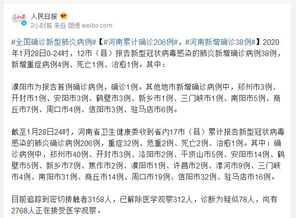 截至1月28日24时,河南省卫生健康委收到省内17市(县)累计报告新型冠状病毒感染的肺炎确诊病例206例,重症32例、危重2例、死亡2例、治愈1例。其中:确诊病例中,郑州市40例、开封市3例、洛阳市2例、平顶山市5例、安阳市14例、鹤壁市5例、新乡市7例、焦作市2例、濮阳市1例、许昌市2例、漯河市9例、三门峡市4例、南阳市31例、商丘市14例、周口市19例、信阳市32例、驻马店市16例。