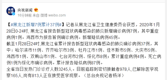 截至1月28日24时,黑龙江省累计报告新型冠状病毒感染的肺炎确诊病例37例,其中:哈尔滨市11例、齐齐哈尔市3例、牡丹江市1例、佳木斯市5例、大庆市5例、鸡西市1例、双鸭山市1例、七台河市2例、绥化市8例;累计重症病例4例。死亡病例1例为绥化市确诊病例。累计报告疑似病例87例。