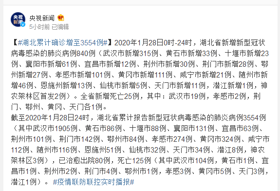 截至2020年1月28日24时,湖北省累计报告新型冠状病毒感染的肺炎病例3554例(其中武汉市1905例、黄石市86例、十堰市88例、襄阳市131例、宜昌市63例、荆州市101例、荆门市142例、鄂州市84例、孝感市274例、黄冈市324例、咸宁市112例、随州市116例、恩施州51例、仙桃市32例、天门市34例、潜江8例,神农架林区3例),已治愈出院80例,死亡125例(其中武汉市104例,黄石市1例、宜昌市1例、荆州市2例、荆门市4例、鄂州市1例,孝感3例、黄冈市5例、天门3例,潜江1例)。