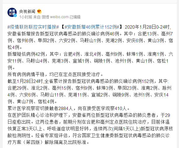 截至1月28日24时,全省累计报告新型冠状病毒感染的肺炎确诊病例152例,其中:合肥29例、淮北2例、亳州15例、宿州9例、蚌埠3例、阜阳23例、淮南2例、滁州4例、六安6例、马鞍山11例、芜湖11例、宣城2例、铜陵9例、池州1例、安庆14例、黄山7例、宿松4例。