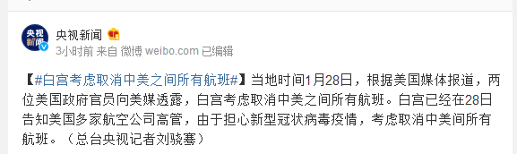 当地时间1月28日,根据美国媒体报道,两位美国政府官员向美媒透露,白宫考虑取消中美之间所有航班。白宫已经在28日告知美国多家航空公司高管,由于担心新型冠状病毒疫情,考虑取消中美间所有航班。(总台央视记者刘骁骞)
