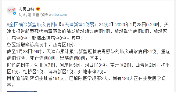 2020年1月28日0-24时,天津市报告新型冠状病毒感染的肺炎新增确诊病例1例,新增重症病例0例,新增死亡病例0例,新增出院病例0例。其中: