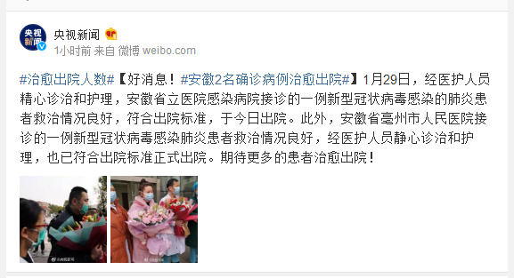 1月29日,经医护人员精心诊治和护理,安徽省立医院感染病院接诊的一例新型冠状病毒感染的肺炎患者救治情况良好,符合出院标准,于今日出院。此外,安徽省亳州市人民医院接诊的一例新型冠状病毒感染肺炎患者救治情况良好,经医护人员静心诊治和护理,也已符合出院标准正式出院。期待更多的患者治愈出院!