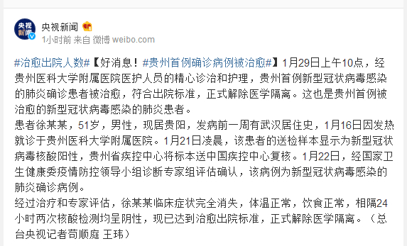 1月29日上午10点,经贵州医科大学附属医院医护人员的精心诊治和护理,贵州首例新型冠状病毒感染的肺炎确诊患者被治愈,符合出院标准,正式解除医学隔离。这也是贵州首例被治愈的新型冠状病毒感染的肺炎患者。