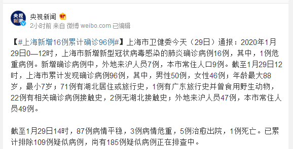 上海市卫健委今天(29日)通报:2020年1月29日0—12时,上海市新增新型冠状病毒感染的肺炎确诊病例16例,其中,1例危重病例。新增确诊病例中,外地来沪人员7例,本市常住人口9例。截至1月29日12时,上海市累计发现确诊病例96例,其中,男性50例,女性46例;年龄最大88岁,最小7岁;71例有湖北居住或旅行史,1例有广东旅行史并曾食用野生动物,22例有相关确诊病例接触史,2例无湖北接触史;外地来沪人员47例,本市常住人员49例。