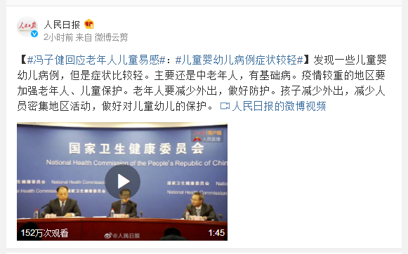 发现一些儿童婴幼儿病例,但是症状比较轻。主要还是中老年人,有基础病。疫情较重的地区要加强老年人、儿童保护。老年人要减少外出,做好防护。孩子减少外出,减少人员密集地区活动,做好对儿童幼儿的保护。