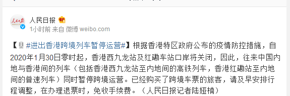 根据香港特区政府公布的疫情防控措施,自2020年1月30日零时起,香港西九龙站及红磡车站口岸将关闭,因此,往来中国内地与香港间的列车(包括香港西九龙站至内地间的高铁列车,香港红磡站至内地间的普速列车)同时暂停跨境运营。已经购买了跨境车票的旅客,请及早安排行程调整,在办理退票时,免收手续费。(人民日报记者陆娅楠)