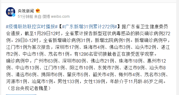 据广东省卫生健康委员会通报,截至1月29日12时,全省累计报告新型冠状病毒感染的肺炎确诊病例272例。29日0-12时,全省新增确诊病例31例,新增出院病例1例。新增确诊病例中,江门市1例为首次报告,深圳市17例、珠海市4例、佛山市3例、汕头市2例、湛江市2例、中山市1例、茂名市1例。有1286名密切接触者正在接受医学观察。