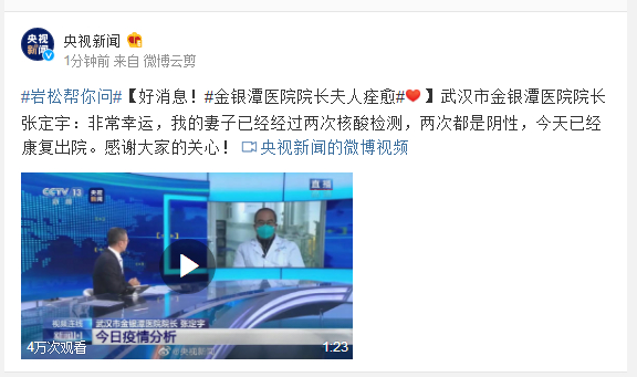 武汉市金银潭医院院长张定宇:非常幸运,我的妻子已经经过两次核酸检测,两次都是阴性,今天已经康复出院。感谢大家的关心!