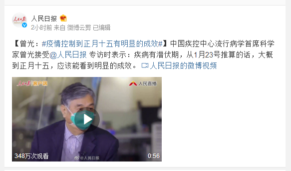 中国疾控中心流行病学首席科学家曾光接受@人民日报 专访时表示:疾病有潜伏期,从1月23号推算的话,大概到正月十五,应该能看到明显的成效。