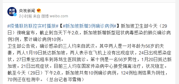 截至今天(29日)下午2点,新加坡共有10例确诊病例,124例检测结果为阴性,70例还在检测中。(总台记者邓雪梅)