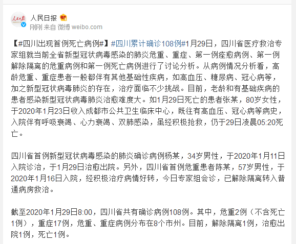 截至2020年1月29日8:00,四川省共有确诊病例108例。其中,危重2例(不含死亡1例),重症17例,危重、重症病例分布在8个市州。目前,解除隔离1例,治愈出院1例,死亡1例。