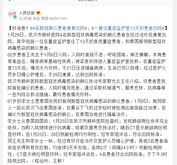 【好消息!#4名新冠肺炎患者康复出院#,#一曾住重症监护室13天的患者出院#】1月29日,武汉市肺科医院4名新型冠状病毒感染的肺炎患者在经过治疗后康复出院,其中包括一位在重症监护室住了13天的急危重症患者,和泰国首例新型冠状病毒感染的肺炎患者。