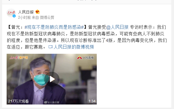 曾光接受@人民日报 专访时表示:我们现在不是防新型冠状病毒肺炎,是防新型冠状病毒感染,可能有些病人不到肺炎的程度,但是他是传染源。所以现在诊断标准出了4版,是因为病毒变化快,我们在适应,跟它赛跑。