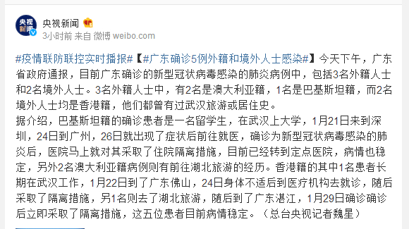 据介绍,巴基斯坦籍的确诊患者是一名留学生,在武汉上大学,1月21日来到深圳,24日到广州,26日就出现了症状后前往就医,确诊为新型冠状病毒感染的肺炎后,医院马上就对其采取了住院隔离措施,目前已经转到定点医院,病情也稳定,另外2名澳大利亚籍病例则有前往湖北旅游的经历。香港籍的其中1名患者长期在武汉工作,1月22日到了广东佛山,24日身体不适后到医疗机构去就诊,随后采取了隔离措施,另1名则去了湖北旅游,随后到了广东湛江,1月29日确诊确诊后立即采取了隔离措施,这五位患者目前病情稳定。(总台央视记者魏星)