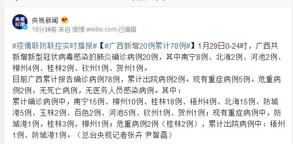 1月29日0-24时,广西共新增新型冠状病毒感染的肺炎确诊病例20例,其中南宁8例、北海2例、河池2例、柳州4例、桂林2例、钦州1例、贺州1例。
