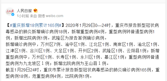 截至1月29日24时,重庆市累计报告新型冠状病毒感染的肺炎确诊病例165例,重型病例18例,危重型病例4例,出院病例1例。