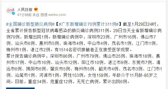 截至1月29日24时,全省累计报告新型冠状病毒感染的肺炎确诊病例311例。29日当天全省新增确诊病例70例,新增出院1例。新增确诊病例中,深圳市23例、广州市16例、佛山市7例、汕头市6例、惠州市5例、珠海市4例、中山市4例、茂名市1例、江门市1例、梅州市1例、湛江市2例。有1514名密切接触者正在接受医学观察。