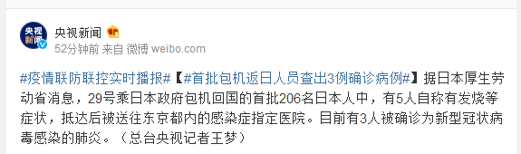 据日本厚生劳动省消息,29号乘日本政府包机回国的首批206名日本人中,有5人自称有发烧等症状,抵达后被送往东京都内的感染症指定医院。目前有3人被确诊为新型冠状病毒感染的肺炎。(总台央视记者王梦)