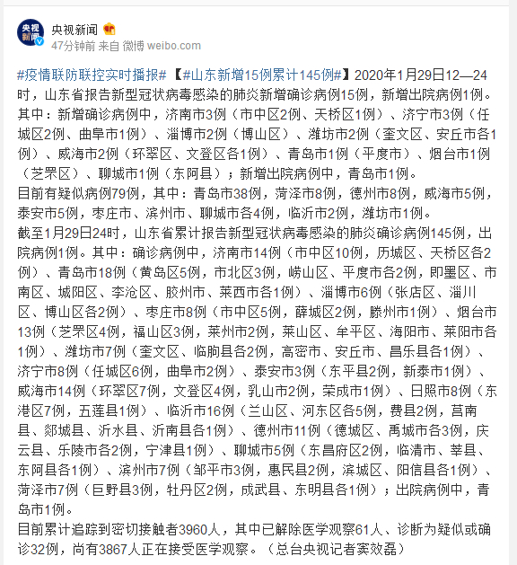 截至1月29日24时,山东省累计报告新型冠状病毒感染的肺炎确诊病例145例,出院病例1例。其中:确诊病例中,济南市14例(市中区10例,历城区、天桥区各2例)、青岛市18例(黄岛区5例,市北区3例,崂山区、平度市各2例,即墨区、市南区、城阳区、李沧区、胶州市、莱西市各1例)、淄博市6例(张店区、淄川区、博山区各2例)、枣庄市8例(市中区5例,薛城区2例,滕州市1例)、烟台市13例(芝罘区4例,福山区3例,莱州市2例,莱山区、牟平区、海阳市、莱阳市各1例)、潍坊市7例(奎文区、临朐县各2例,高密市、安丘市、昌乐县各1例)、济宁市8例(任城区6例,曲阜市2例)、泰安市3例(东平县2例,新泰市1例)、威海市14例(环翠区7例,文登区4例,乳山市2例,荣成市1例)、日照市8例(东港区7例,五莲县1例)、临沂市16例(兰山区、河东区各5例,费县2例,莒南县、郯城县、沂水县、沂南县各1例)、德州市11例(德城区、禹城市各3例,庆云县、乐陵市各2例,宁津县1例)、聊城市5例(东昌府区2例,临清市、莘县、东阿县各1例)、滨州市7例(邹平市3例,惠民县2例,滨城区、阳信县各1例)、菏泽市7例(巨野县3例,牡丹区2例,成武县、东明县各1例);出院病例中,青岛市1例。