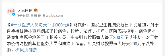 财政部、国家卫生健康委近日下发通知,对于直接接触待排查病例或确诊病例,诊断、治疗、护理、医院感染控制、病例标本采集和病原检测等工作相关人员,中央财政按照每人每天300元予以补助;对于参加疫情防控的其他医务人员和防疫工作者,中央财政按照每人每天200元予以补助。