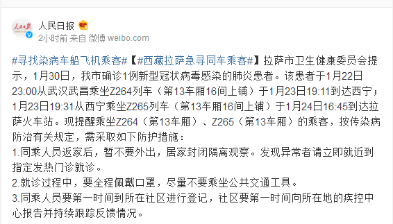 拉萨市卫生健康委员会提示,1月30日,我市确诊1例新型冠状病毒感染的肺炎患者。该患者于1月22日23:00从武汉武昌乘坐Z264列车(第13车厢16间上铺)于1月23日19:11到达西宁;1月23日19:31从西宁乘坐Z265列车(第13车厢16间上铺)于1月24日16:45到达拉萨火车站。现提醒乘坐Z264(第13车厢)、Z265(第13车厢)的乘客,按传染病防治有关规定,需采取如下防护措施: