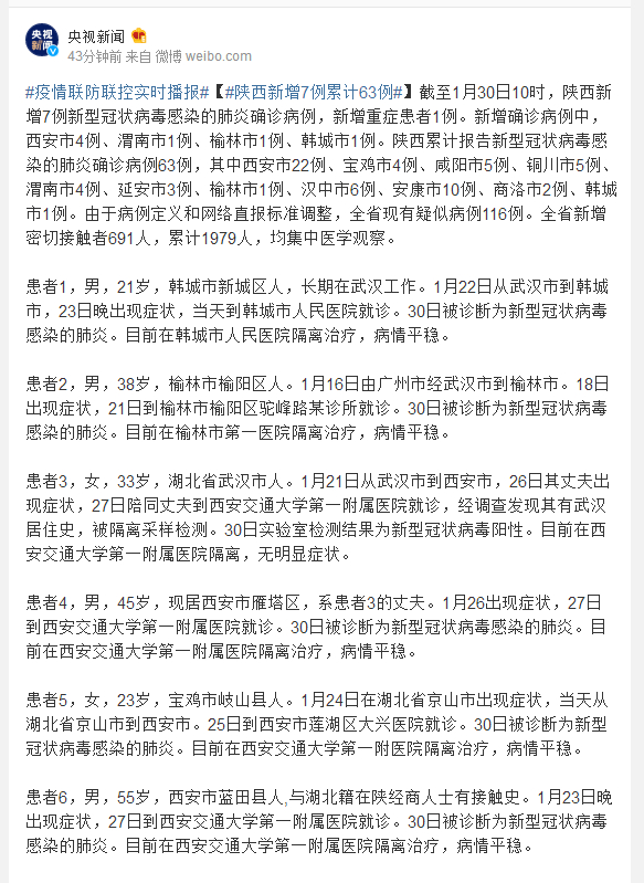 患者6,男,55岁,西安市蓝田县人,与湖北籍在陕经商人士有接触史。1月23日晚出现症状,27日到西安交通大学第一附属医院就诊。30日被诊断为新型冠状病毒感染的肺炎。目前在西安交通大学第一附属医院隔离治疗,病情平稳。