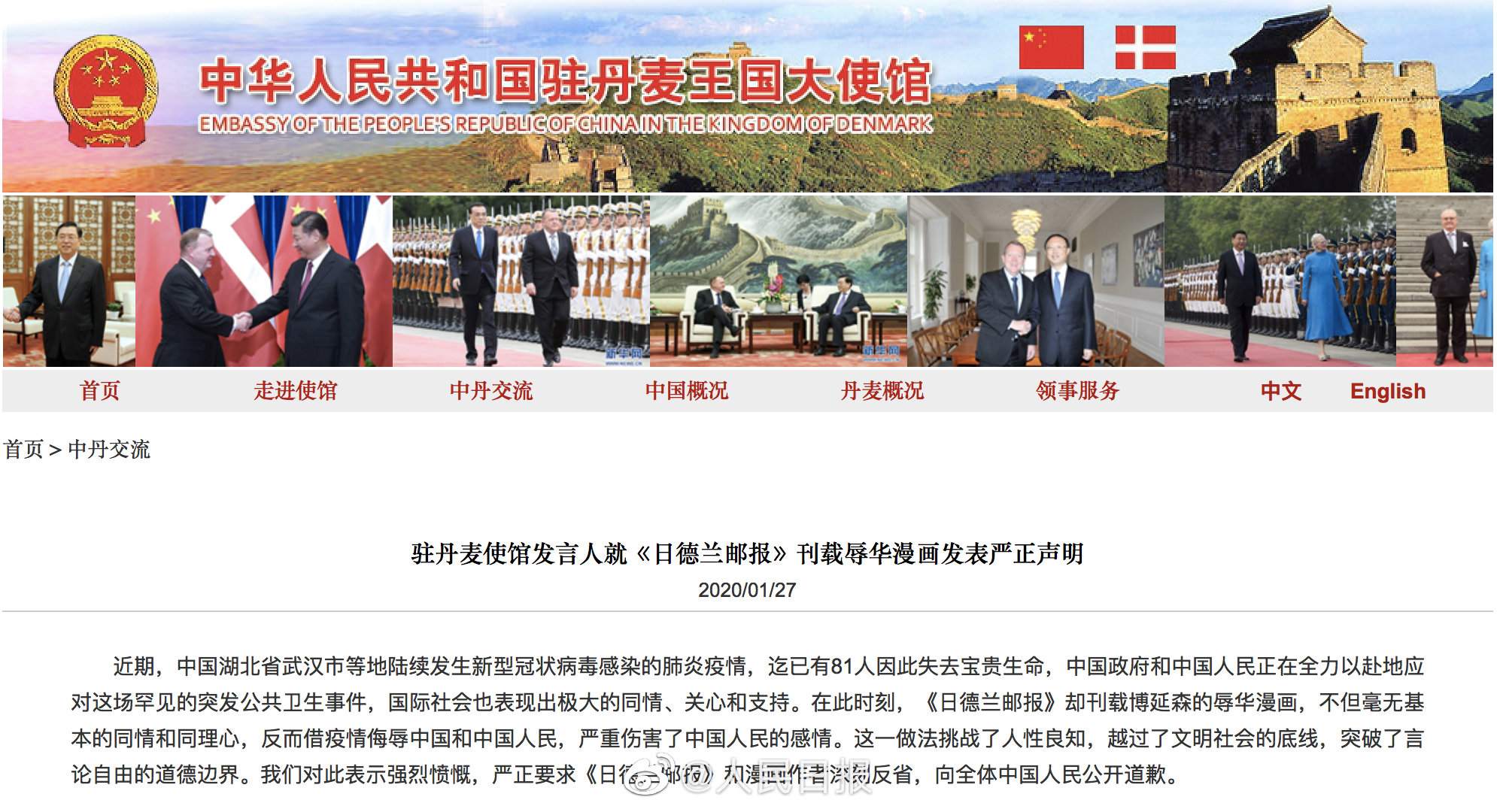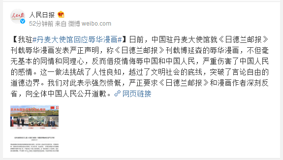 日前,中国驻丹麦大使馆就《日德兰邮报》刊载辱华漫画发表严正声明,称《日德兰邮报》刊载博延森的辱华漫画,不但毫无基本的同情和同理心,反而借疫情侮辱中国和中国人民,严重伤害了中国人民的感情。这一做法挑战了人性良知,越过了文明社会的底线,突破了言论自由的道德边界。我们对此表示强烈愤慨,严正要求《日德兰邮报》和漫画作者深刻反省,向全体中国人民公开道歉。