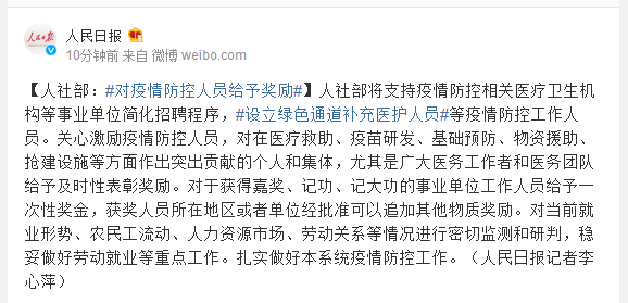 人社部将支持疫情防控相关医疗卫生机构等事业单位简化招聘程序,#设立绿色通道补充医护人员#等疫情防控工作人员。关心激励疫情防控人员,对在医疗救助、疫苗研发、基础预防、物资援助、抢建设施等方面作出突出贡献的个人和集体,尤其是广大医务工作者和医务团队给予及时性表彰奖励。对于获得嘉奖、记功、记大功的事业单位工作人员给予一次性奖金,获奖人员所在地区或者单位经批准可以追加其他物质奖励。对当前就业形势、农民工流动、人力资源市场、劳动关系等情况进行密切监测和研判,稳妥做好劳动就业等重点工作。扎实做好本系统疫情防控工作。(人民日报记者李心萍)